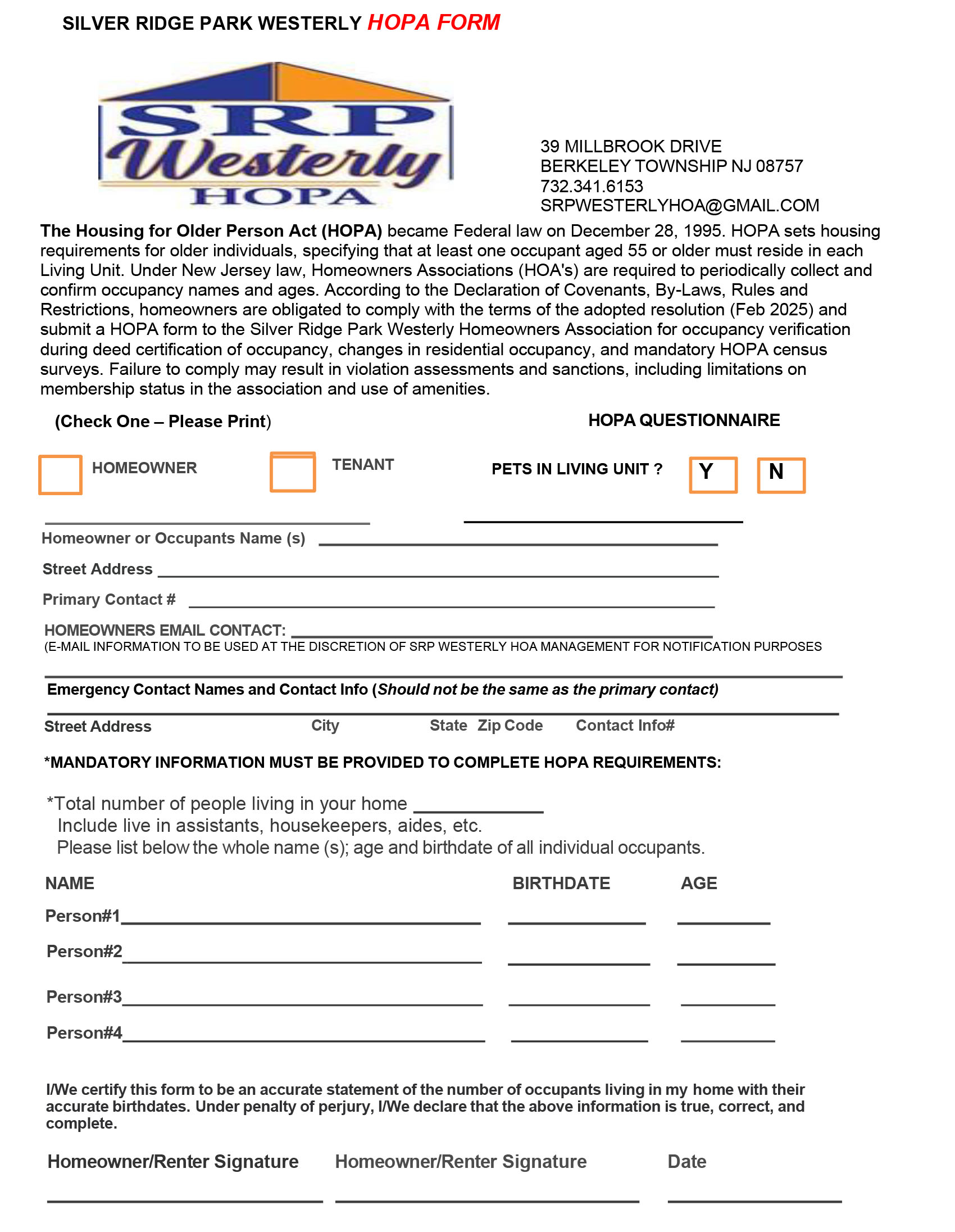 Under NJ Law, HOAs are required to perform a biennial collection and verification of occupancy with age identities of all residences.